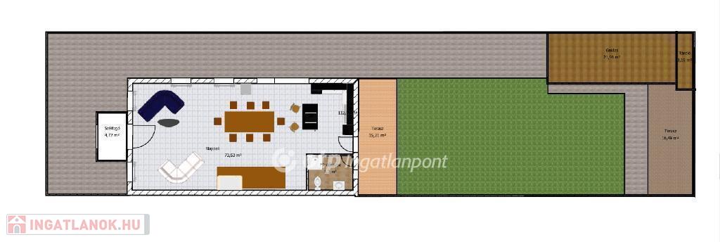 Emellett rendelkezésre áll egy 15 négyzetméteres, a házból közvetlen kapcsolatú terasz és a kert hátsó részében pedig egy közművesített (víz, villany) 16,5 nm-es fedett terasz saját kemencével.