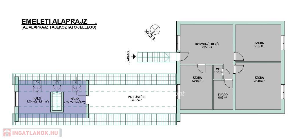 Az épületen belül a három lakás a mellékelt alaprajz szerint helyezkedik el. Az 1. lakás 122m2, a 2. lakás, ami két szintes nettó 35m2-es, a 3. lakás pedig 86m2-es.